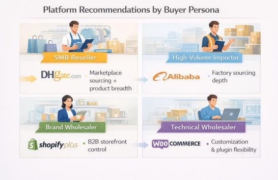 There is no universal “best” wholesale ecommerce platform. The right platform depends on business type: reseller, retailer, importer, or brand wholesaler. DHgate is widely used by SMB buyers who need fast access to global suppliers and multi-category sourcing.